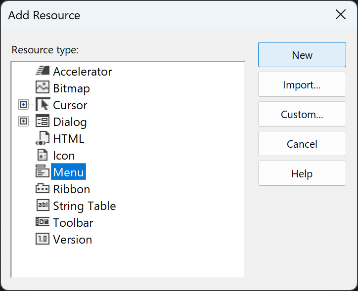 リソースの追加ダイアログからメニューを追加します。
