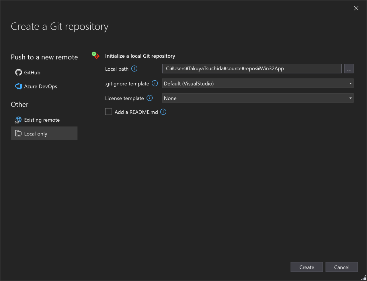 Git > Create Git Repository… で、ローカル Git リポジトリを作成します。.gitignore テンプレートは Default (VisualStudio) にします。