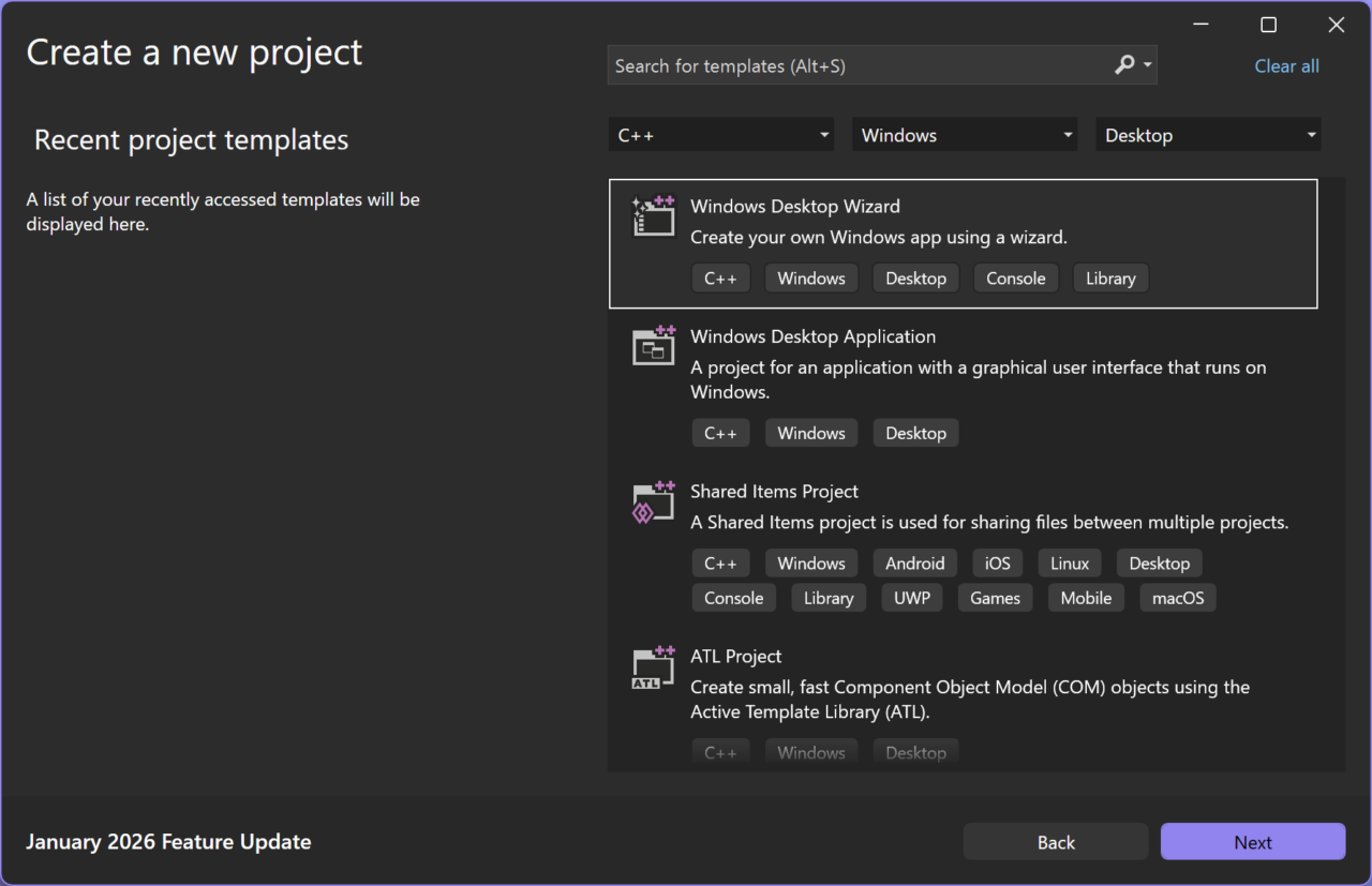 空のプロジェクトを作成したいので、新しいプロジェクトを作成するときに Windows Desktop Wizard を選択します。