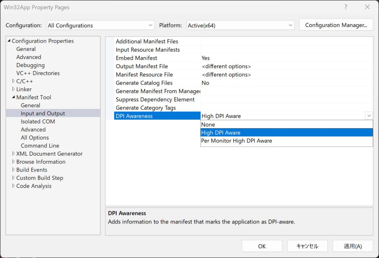 さらに、文字を明瞭にするにはプロセスの既定の DPI 認識を設定する必要があります。こちらもアプリケーションマニフェストでの設定が王道なのですが、今回はプロジェクトのプロパティにあるマニフェストツールの DPI Awareness で High DPI Aware を指定することで対応します。