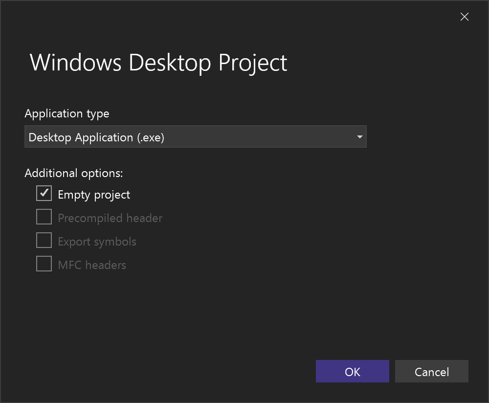 ウィザードが立ち上がるので、Application type で Desktop Application (.exe) を選択し、Empty project にチェックを入れて OK をクリックします。