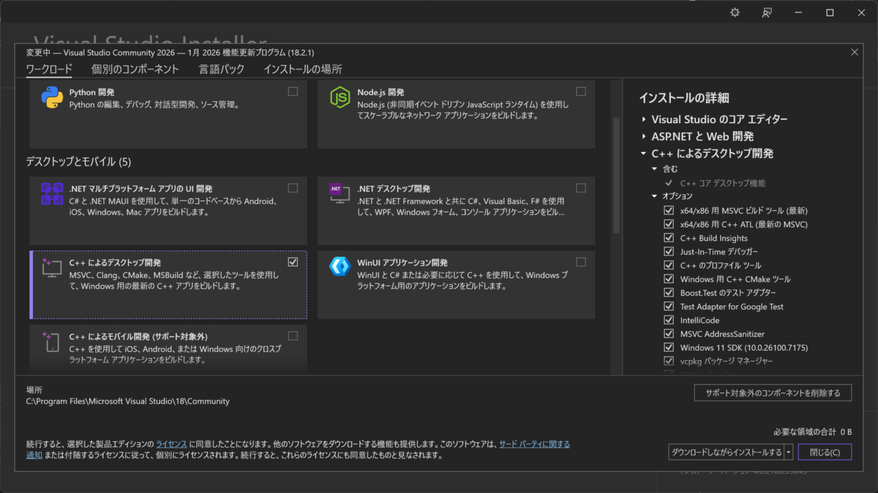 Visual Studio Community 2026 を「C++ によるデスクトップ開発」ワークロードにチェックを入れてインストールします。なお、私の Visual Studio Community 2026 環境は言語パックを英語にしているため、Visual Studio Community 2026 の画面は英語表示になり、説明上も一部で英語名称を使用しています。