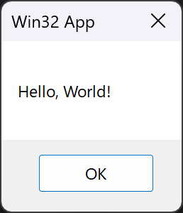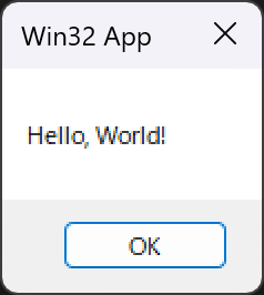 MessageBox(nullptr, L"Hello, World!", L"Win32 App", MB_OK);