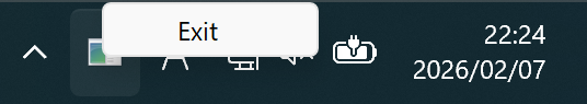 ビルドして実行すると通知アイコンが表示されます。表示されない場合、非表示のアイコンメニューの中に隠れていると思います。右クリックするとコンテキストメニューが表示され、Exit をクリックするとアプリケーションが終了します。
